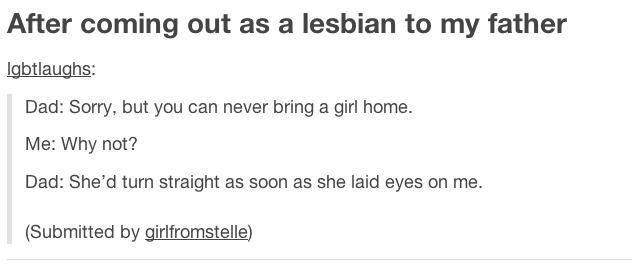 After coming out as a lesbian to my father... Dad: Sorry, but you can never bring a girl home. Me: Why not? Dad: She'd turn straight as soon as she laid eyes on me.