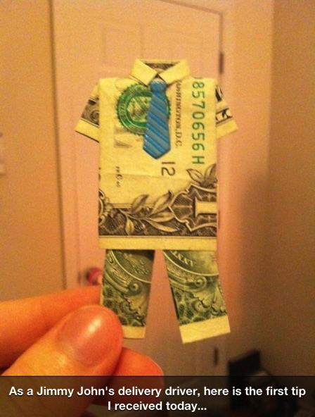 As a Jimmy John's delivery driver, here is the first tip I received today. Ikebana suit from money !