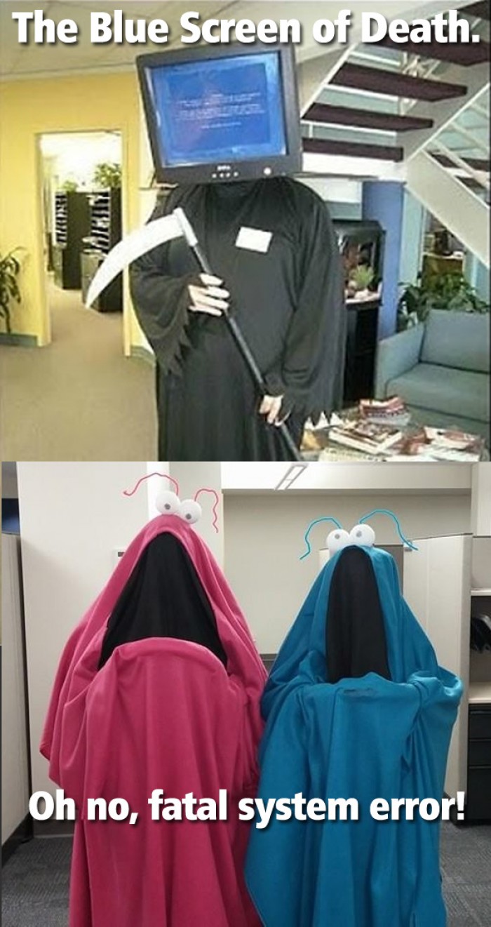 The Blue Screen of Death. Oh no fatal system error.Best fancy dress ever :) -meme. The Blue Screen of Death (also known as a stop error, bluescreen, Blue Screen of Doom, BSoD, bug check screen or Stop screen) is an error screen displayed after a fatal system error.