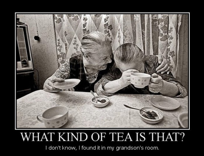 What kind of tea is that? I don't know I found it in my grandson's room. :) I suppose tea is made with marijuana. Here are some common terms for marijuana, with some more familiar than others: Pot, Weed,Grass,420, Ganga, Dope, Herb,Joint, Blunt,Cannabis, Reefer, Mary Jane, Buds, Stinkweed, Nuggets....